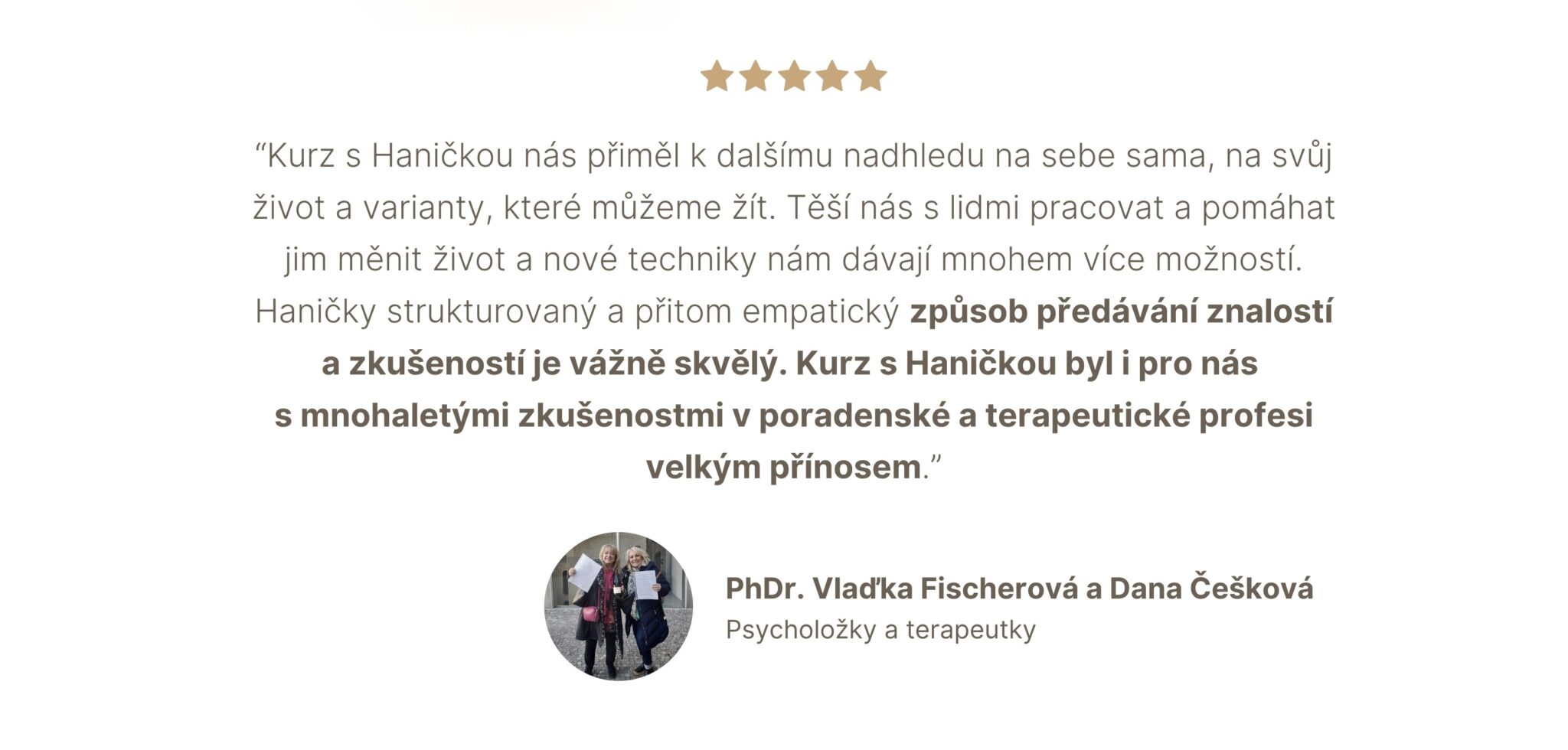 Hanička byla stále pro nás po celou dobu kurzu.Práci dělá srdcem a to je znát. Bc. Pavlína Pánová, PRŮVODKYNĚ.